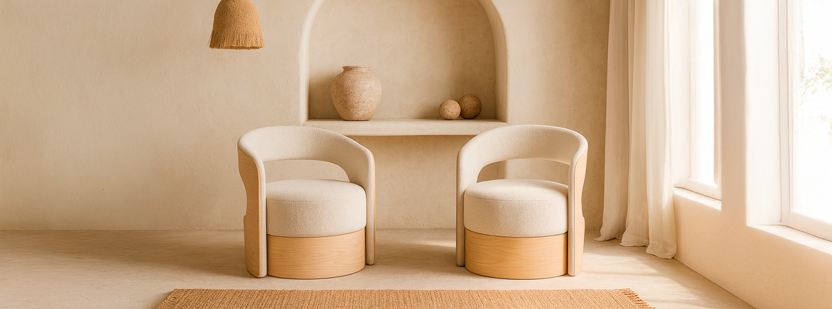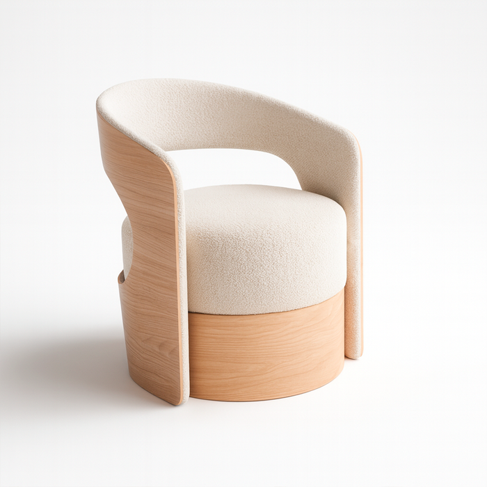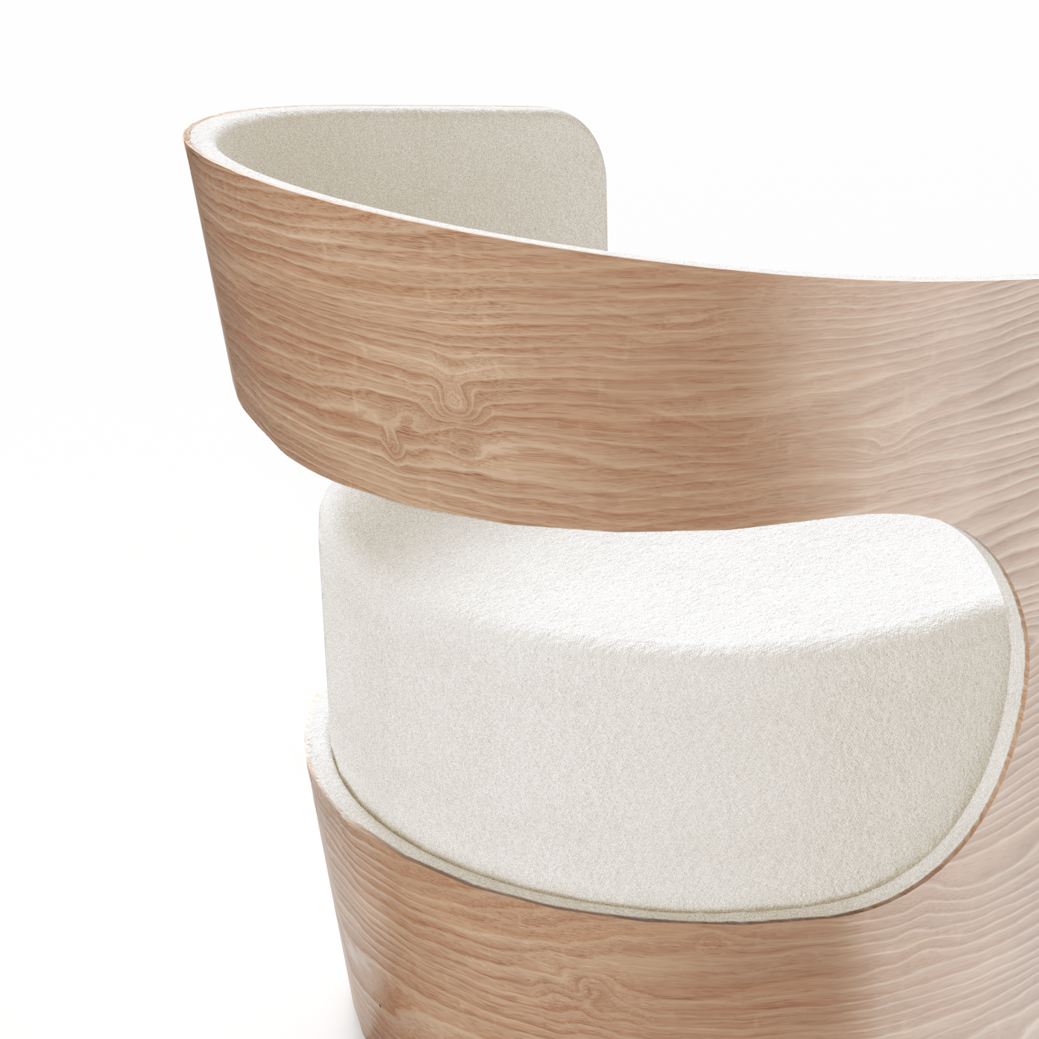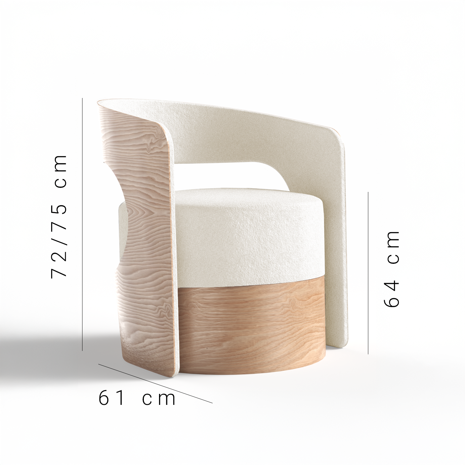 La poltrona samantha combina diseño contemporáneo y funcionalidad con una estructura de madera clara de líneas envolventes y un asiento circular tapizado en bouclé, suave y acogedor. Su respaldo curvo aporta ergonomía y ligereza, mientras que la base giratoria le da practicidad y dinamismo. Una pieza elegante y versátil, ideal para ambientes modernos, mediterráneos o nórdicos.