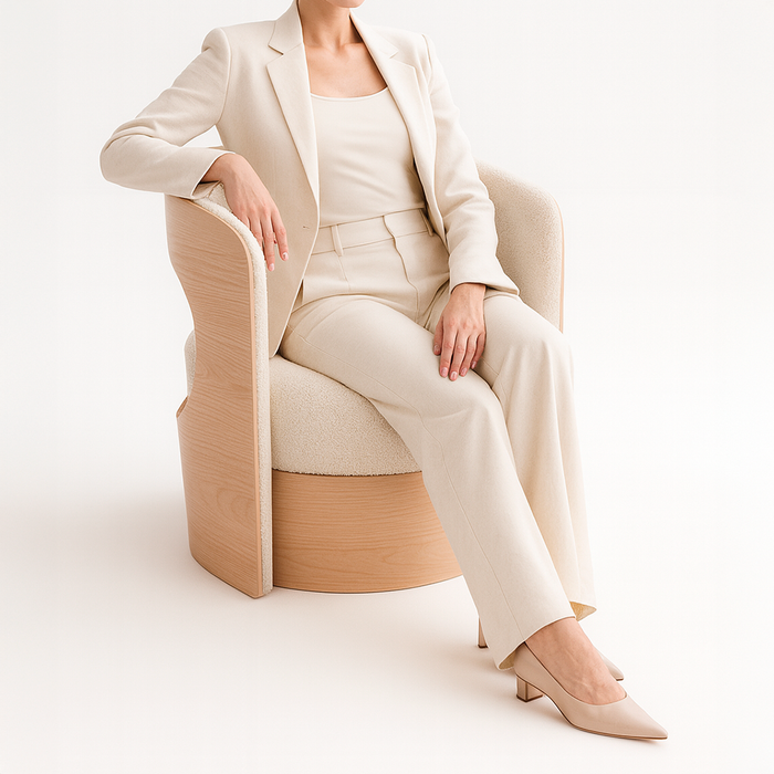 El respaldo curvo, también tapizado en la misma tela, ofrece un soporte ergonómico que envuelve de manera delicada, transmitiendo comodidad sin perder su estética minimalista.