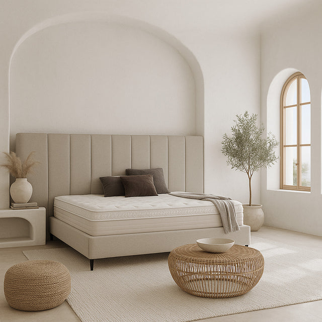 El estilo de la Cama Ravena, con respaldo y somier, es elegante y sofisticado, confeccionado a medida con tela de lino para un aspecto natural y fresco.