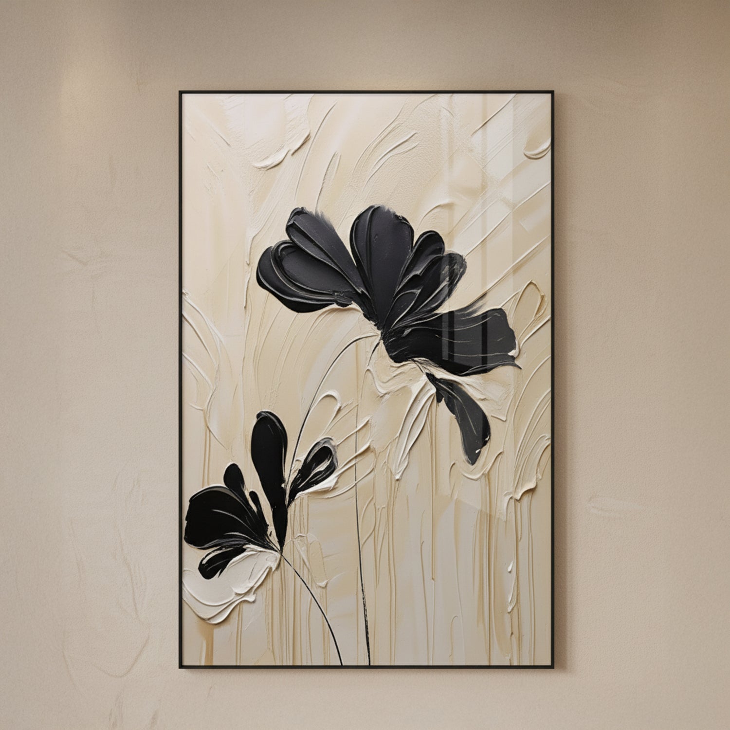 Sofisticado cuadro con flores negras sobre fondo texturizado beige y crema, enmarcado en aluminio cepillado negro. Su técnica con relieves aporta profundidad y movimiento, creando una pieza contemporánea perfecta para elevar cualquier espacio con elegancia y estilo moderno.