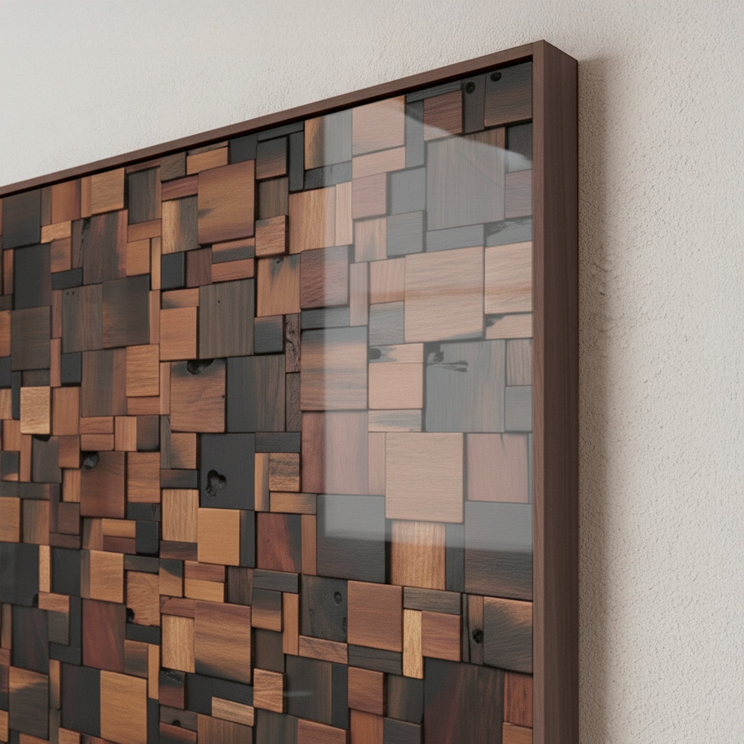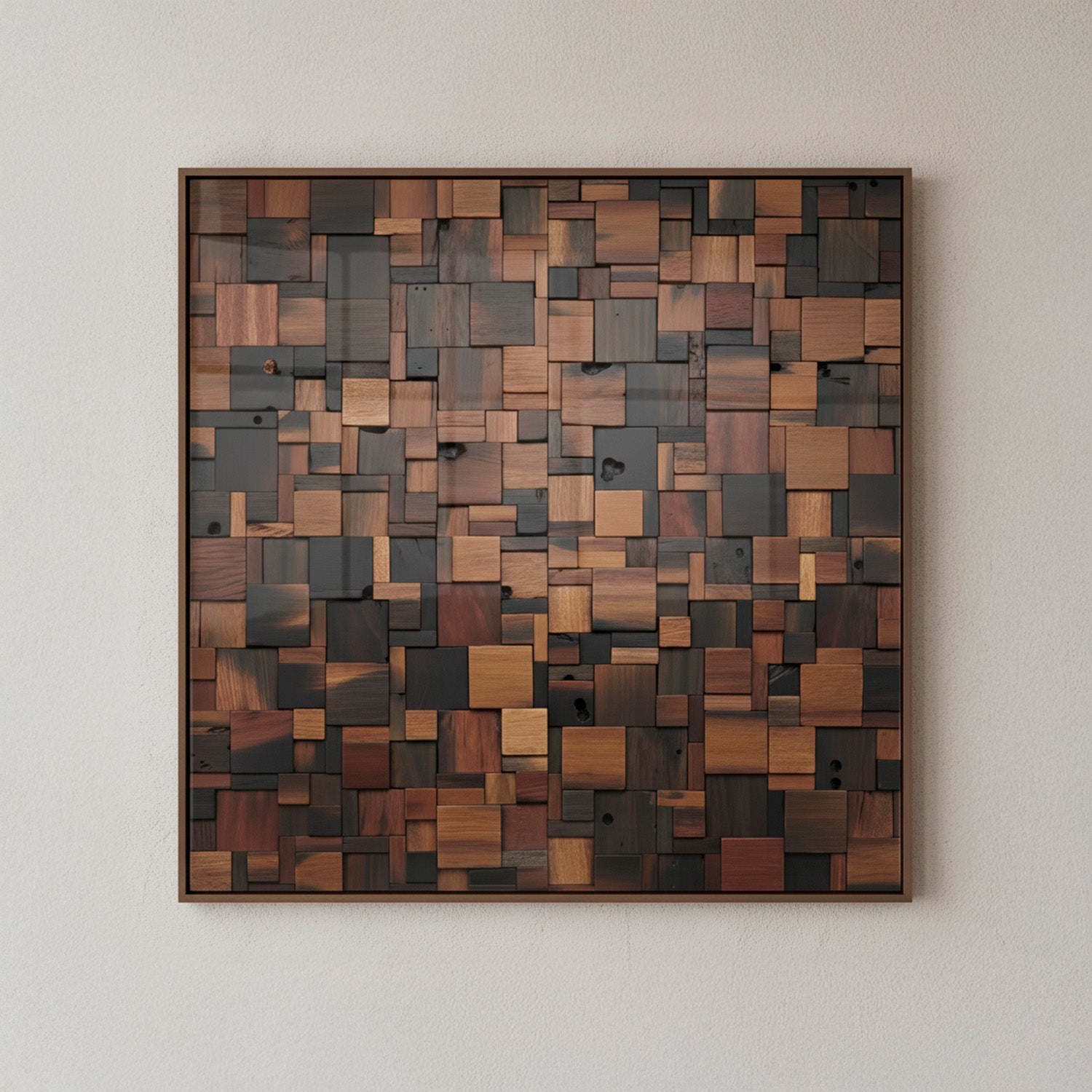 Impresionante cuadro contemporáneo que combina bloques de madera natural y metal en un elegante mosaico 3D. Con marco de aluminio cepillado color nuez, esta pieza de 80x80cm aporta textura, profundidad y sofisticación a cualquier ambiente moderno.