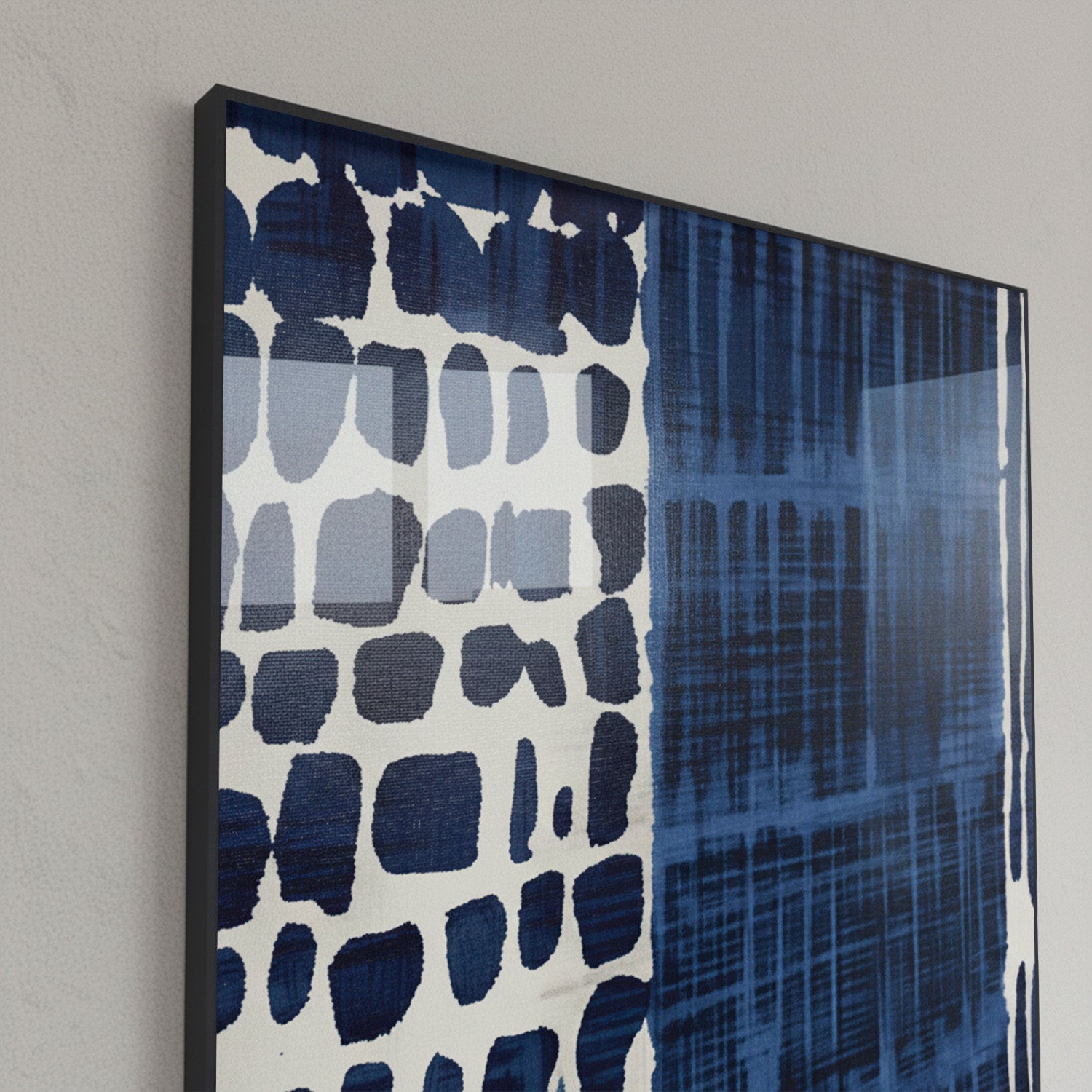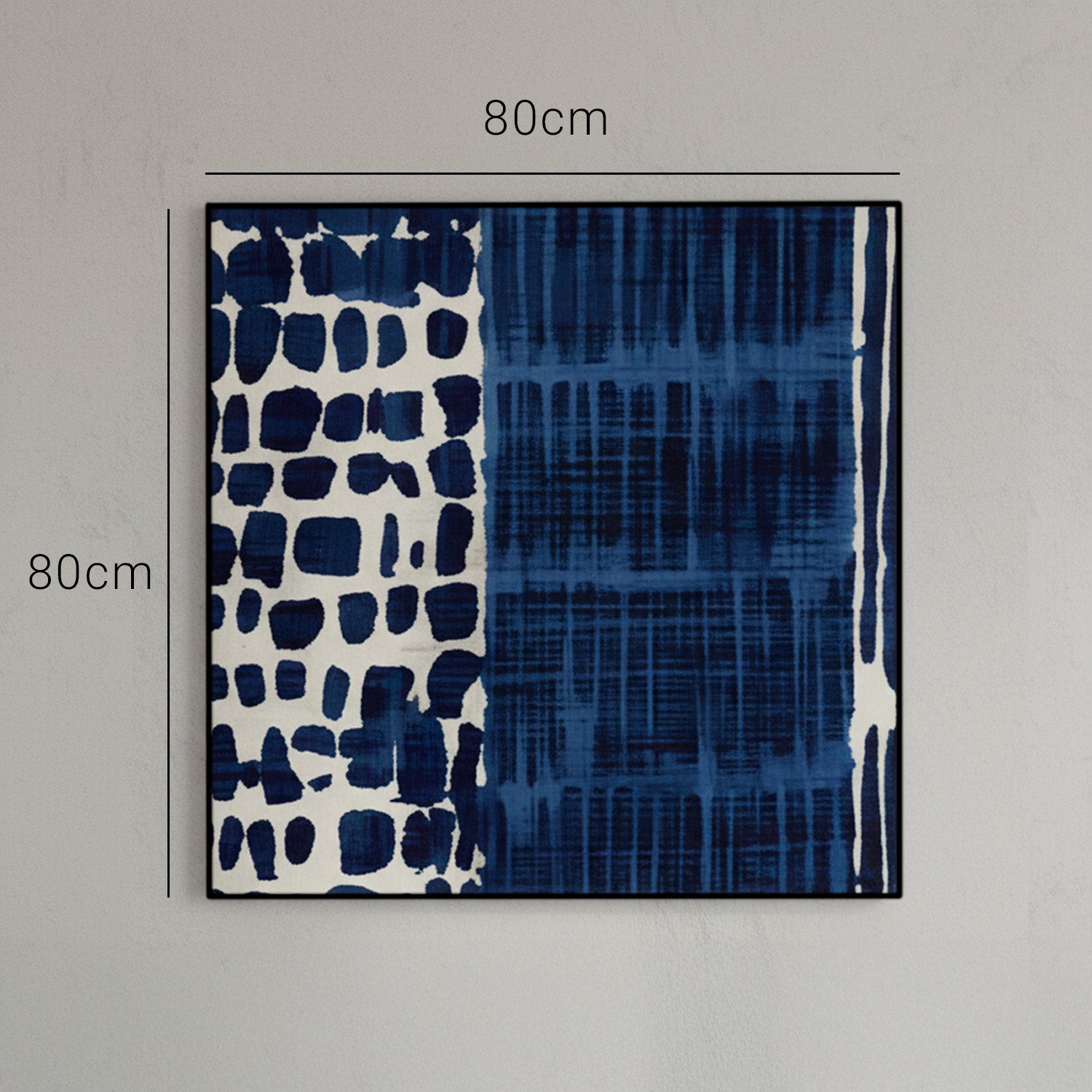 Transforma tu espacio con esta elegante obra abstracta en azul índigo que combina patrones orgánicos únicos con texturas lineales relajantes. Su marco de aluminio negro y formato cuadrado de 80x80cm lo convierten en el protagonista perfecto para cualquier ambiente moderno. Una pieza sofisticada que aporta personalidad y serenidad a tus paredes.