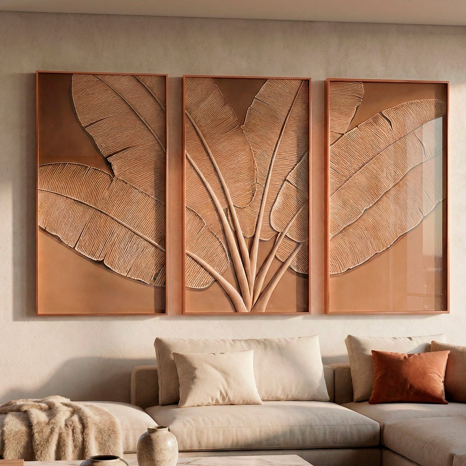 Transforma tu espacio con este elegante set de 3 cuadros decorativos que presenta hojas de palma en tonos naturales dorados. Su marco de madera natural complementa cualquier estilo decorativo, desde minimalista hasta boho chic, convirtiendo cualquier pared en un punto focal sofisticado que irradia calidez y serenidad tropical en tu hogar.