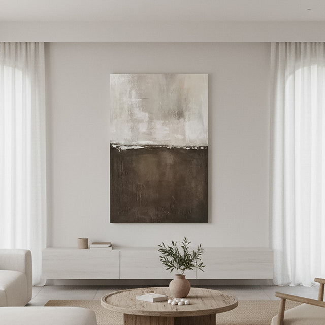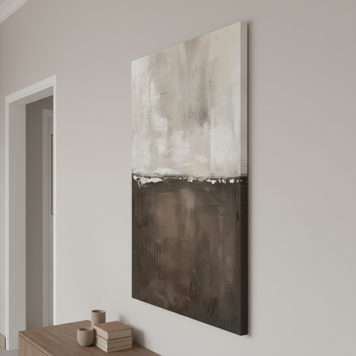 Transforma tu espacio con esta impactante obra abstracta de 80x120 cm que destaca por su composición moderna y sofisticada. Los tonos neutros contrastan elegantemente con las texturas profundas en tierra y marrón, creando una pieza versátil que aporta calidez y personalidad a cualquier ambiente. Su formato vertical y estilo contemporáneo la convierte en la elección perfecta para darle a tu pared ese toque distintivo que marca la diferencia.