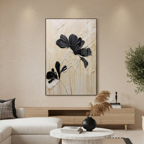 Sofisticado cuadro con flores negras sobre fondo texturizado beige y crema, enmarcado en aluminio cepillado negro. Su técnica con relieves aporta profundidad y movimiento, creando una pieza contemporánea perfecta para elevar cualquier espacio con elegancia y estilo moderno.