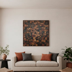 Impresionante cuadro contemporáneo que combina bloques de madera natural y metal en un elegante mosaico 3D. Con marco de aluminio cepillado color nuez, esta pieza de 80x80cm aporta textura, profundidad y sofisticación a cualquier ambiente moderno.