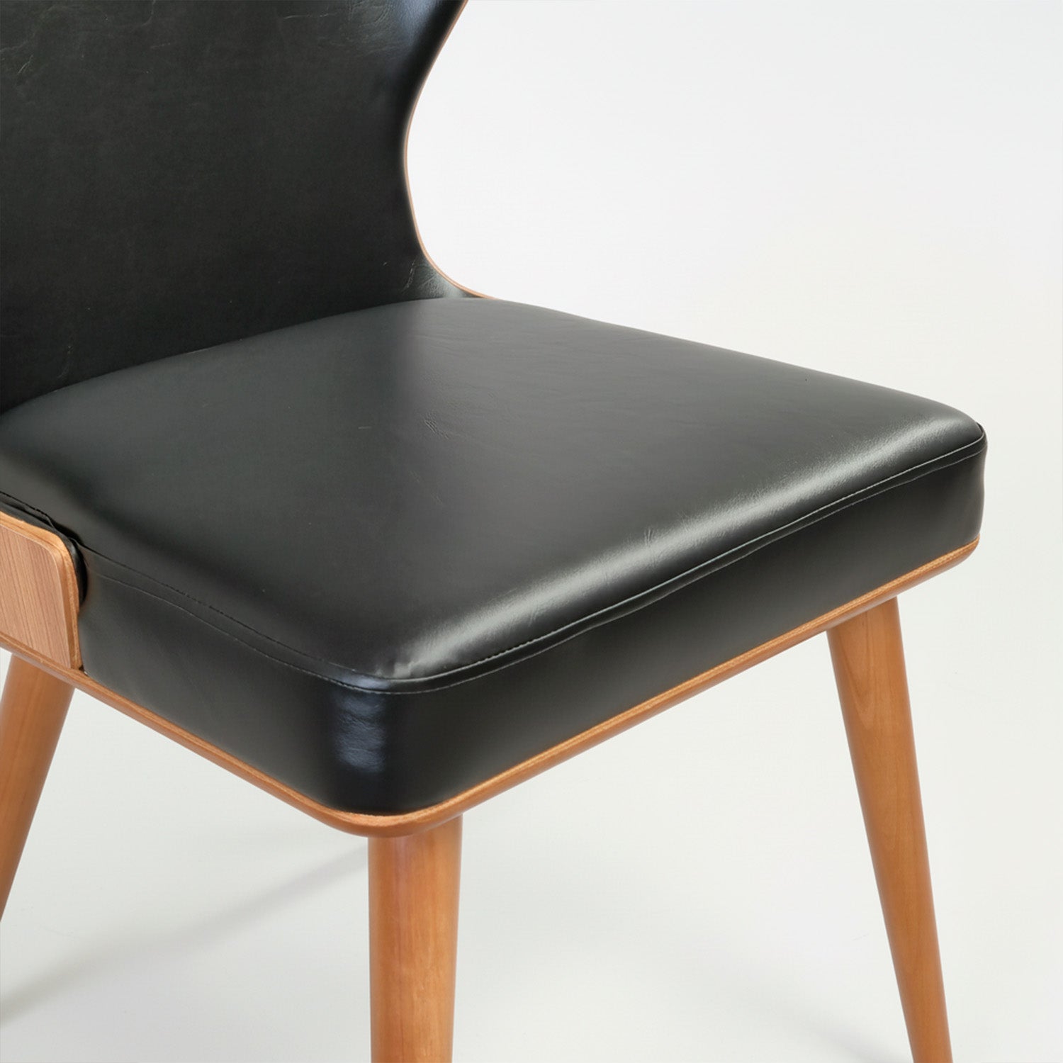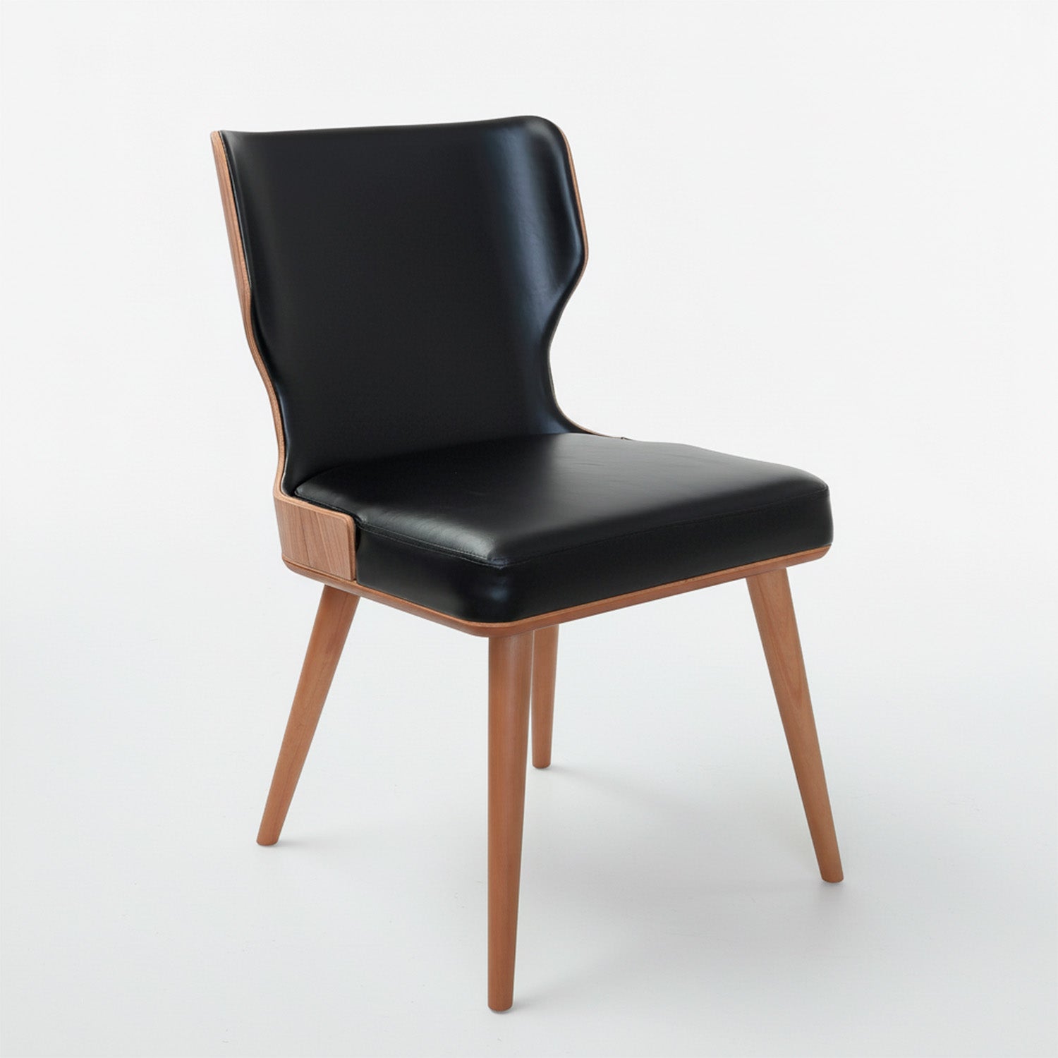 Esta silla combina la calidez de la madera natural con la elegancia del cuero sintético negro en un diseño contemporáneo irresistible. Su respaldo curvado abraza tu espalda mientras el asiento con espuma D28 te ofrece comodidad firme y duradera. Con sus patas inclinadas de aire mid-century, aporta personalidad y estilo atemporal a cualquier espacio sin perder ese toque acogedor que hace la diferencia.