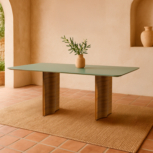 Su elemento más distintivo es la base en forma de pilar curvo, que introduce una fluidez visual única. Esta base no solo proporciona estabilidad estructural, sino que también actúa como un punto focal estético gracias a su silueta ondulada y continua.