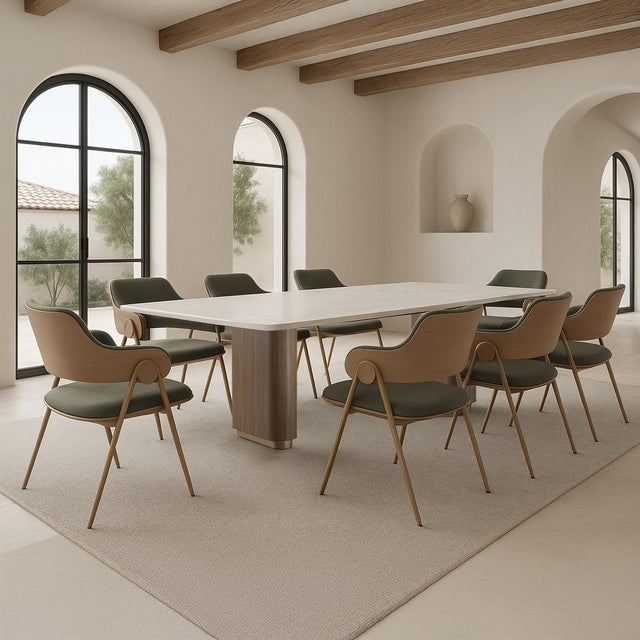 Imagina un comedor donde cada detalle habla de sofisticación, calidez y diseño contemporáneo. Eso es exactamente lo que te ofrece el conjunto mesa Simara y la poltrona Moana.