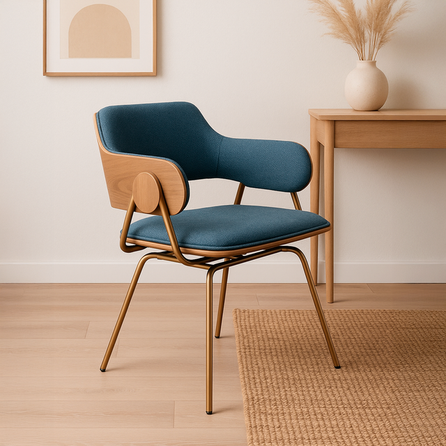 Con un diseño sofisticado que combina líneas orgánicas con precisión geométrica, logrando un equilibrio perfecto entre forma y función. Su silueta envolvente se destaca por una estructura de contrachapado curvado que fluye de manera continua desde el respaldo hacia los apoyabrazos, generando una sensación de unidad y dinamismo visual.