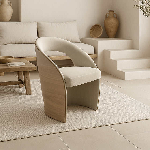 La poltrona Telma fusiona elegantemente madera y tela para crear un diseño que destaca por su sofisticación y calidez, adaptándose con naturalidad a cualquier estilo decorativo. Su distintivo respaldo curvo, cuidadosamente elaborado en madera de primera calidad, garantiza una estructura robusta y duradera que ofrece tanto estabilidad como confort visual.