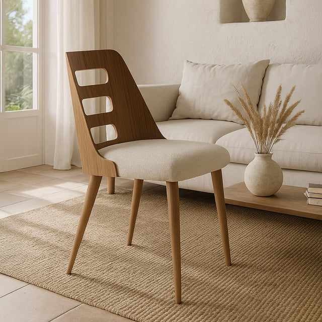 La silla destaca por su diseño moderno y cálido, con respaldo calado que aporta estilo y ventilación. Sus patas cónicas le dan estabilidad y ligereza visual. Es cómoda, versátil y perfecta para realzar cualquier ambiente.