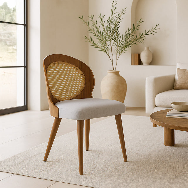 Esta silla destaca por su diseño ergonómico y elegante, ideal para aportar comodidad y estilo a tu hogar. Su respaldo envolvente de madera curvada con tejido natural brinda un soporte ventilado y confortable, mientras que el asiento acolchado en tela suave garantiza confort durante largas horas.