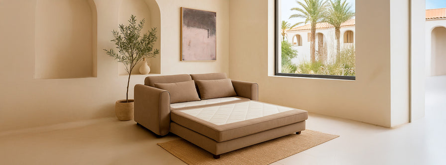 El diseño de este sofá cama destaca por su estética minimalista y funcional.