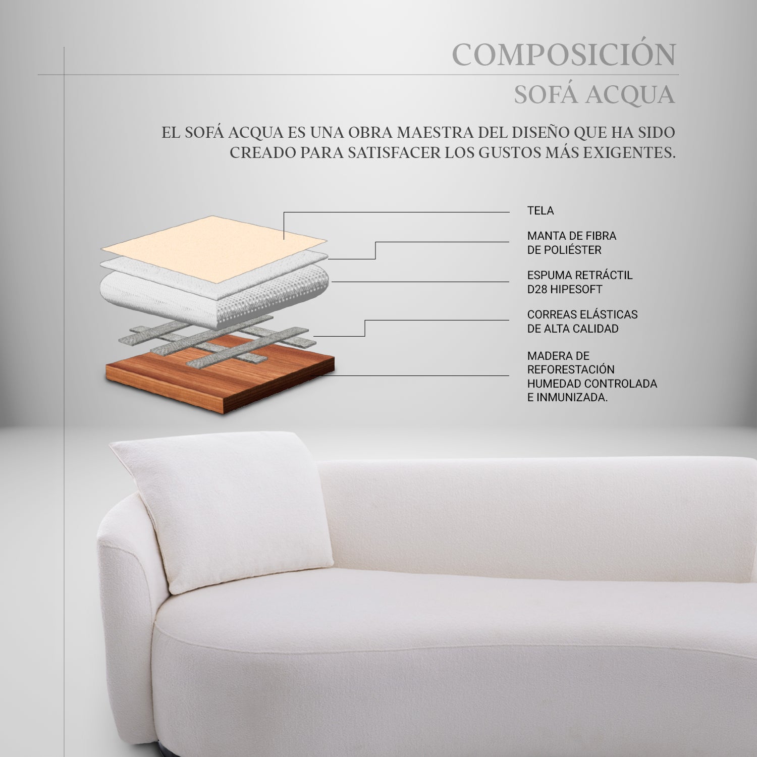 Lo más impresionante del sofá Acqua es su tejido con textura única, que ha sido inspirado en la naturaleza, específicamente en el agua. Esta textura es tan única que no se puede encontrar en ningún otro sofá de la competencia. El tejido es suave, cómodo y tiene una sensación de lujo al tacto, lo que lo convierte en el sofá perfecto para descansar después de un largo día.