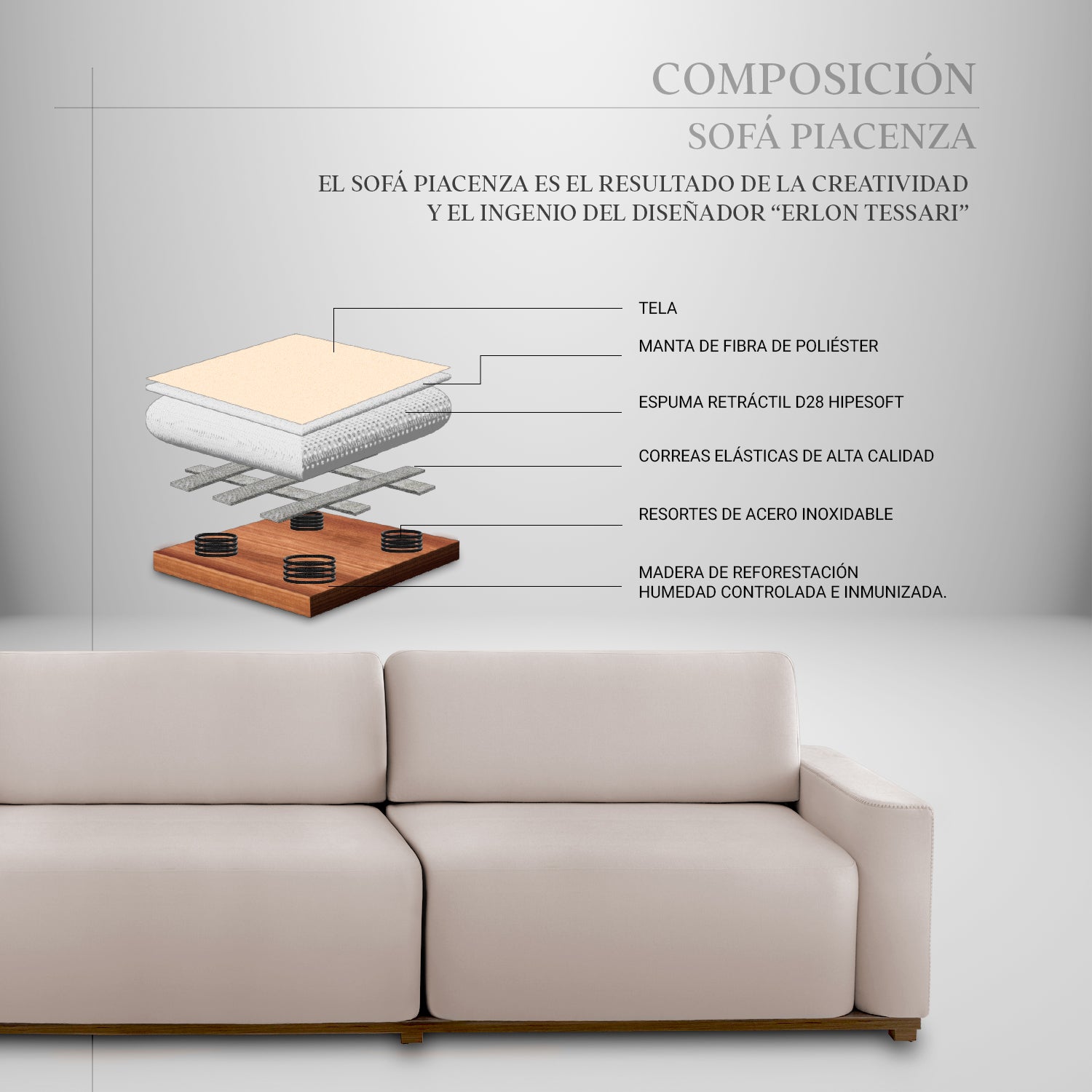 Con acolchado premium y tejidos de tacto suave, el Piacenza ofrece una experiencia de asiento excepcional. Cada momento de descanso es una invitación a disfrutar de su comodidad superior.