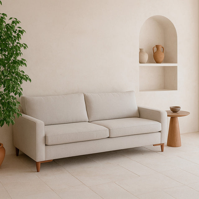 El sofá Sevilha es la definición de elegancia atemporal. Con un diseño limpio y proporciones equilibradas, se adapta fácilmente a diversos estilos de decoración. Las patas cónicas de madera vista aportan ligereza y un toque retro. Ideal para quienes buscan comodidad sin renunciar a un estilo refinado.