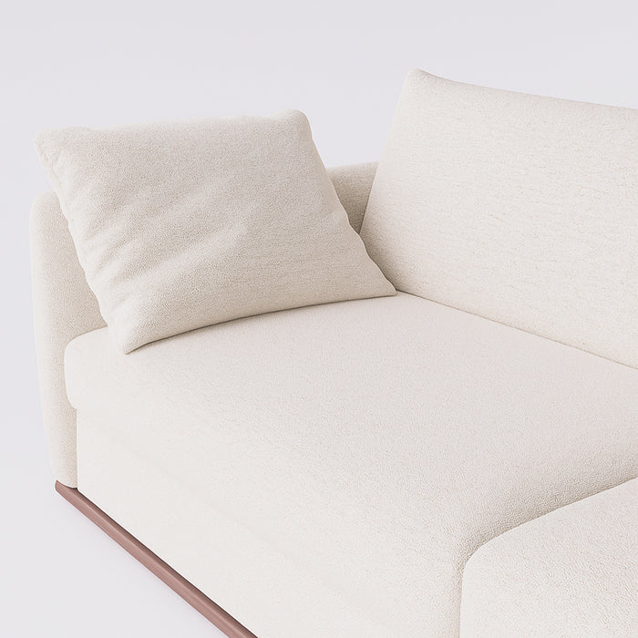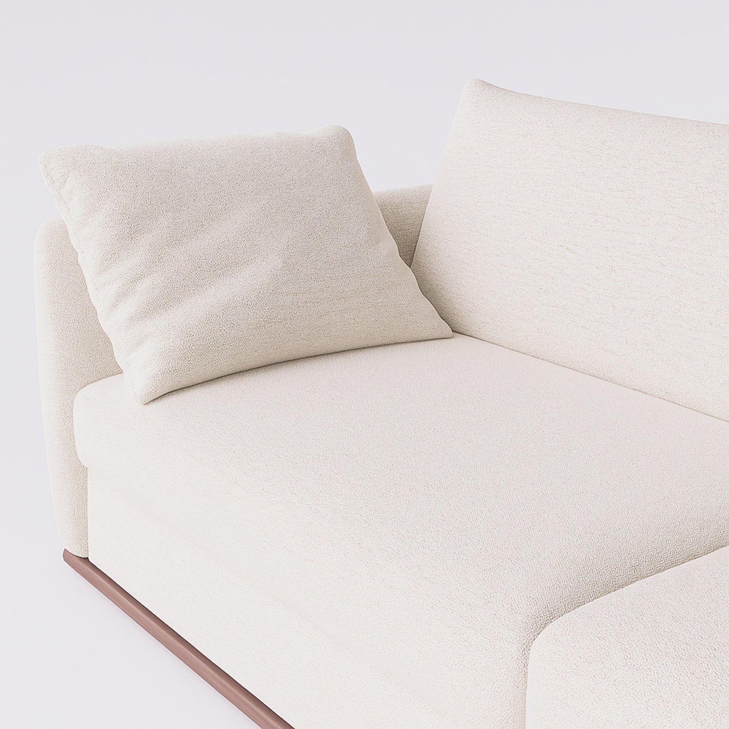 - Respaldo y detalles: Respaldos fijos con cojines sueltos de fibra siliconada que proporcionan un soporte cómodo y un fácil mantenimiento. Se complementan con cojines decorativos que se pueden personalizar según la tela elegida: lino, ante, polipiel o gamuza.