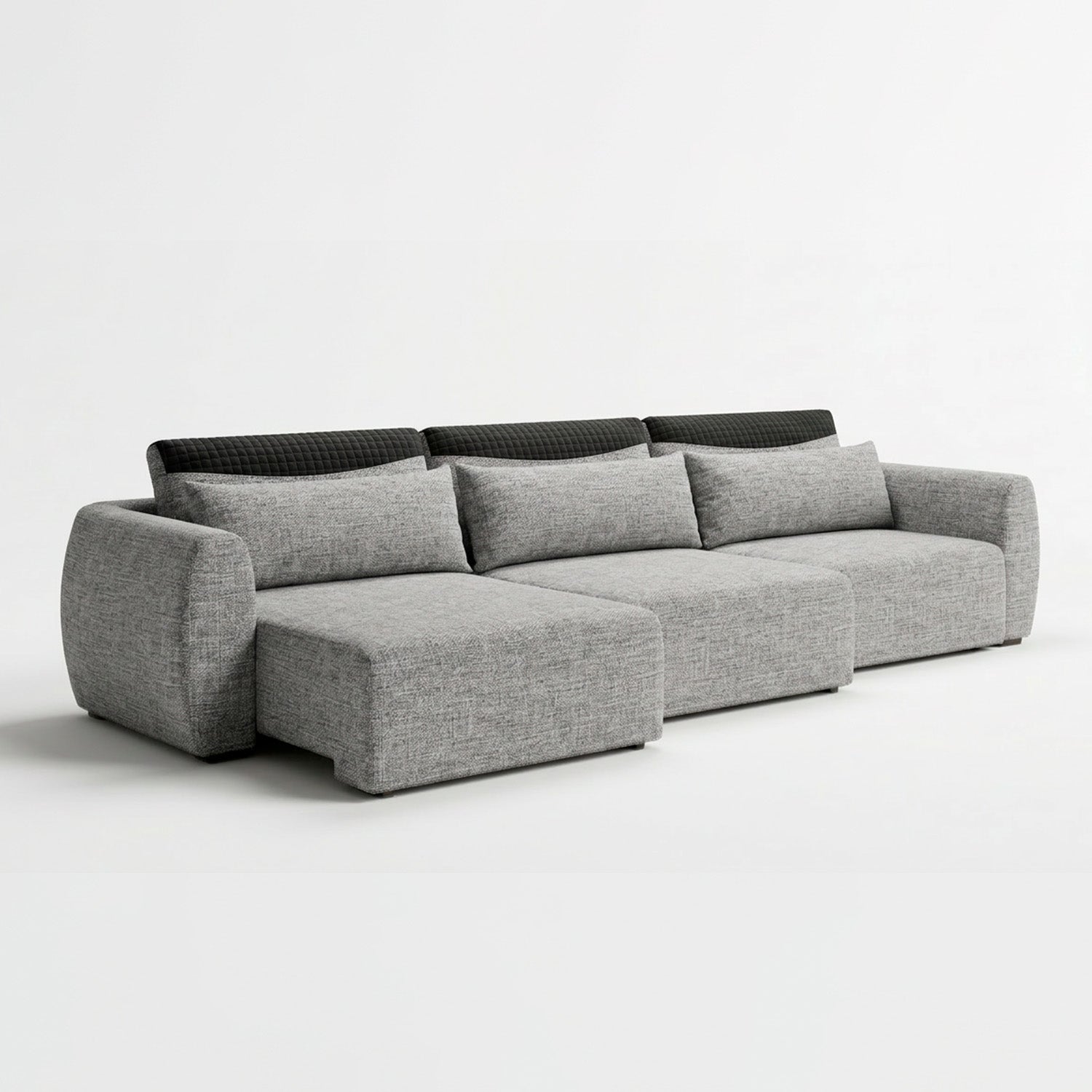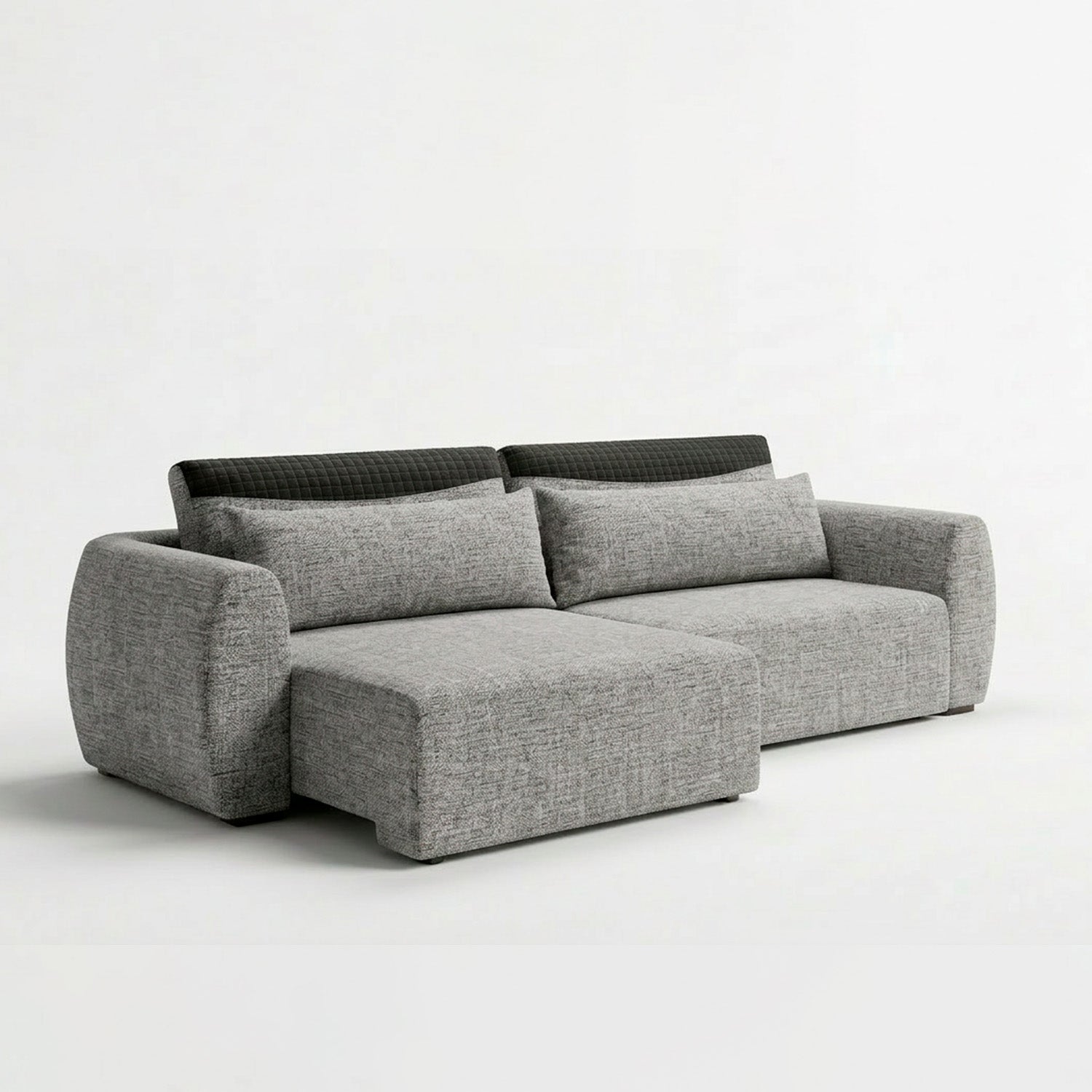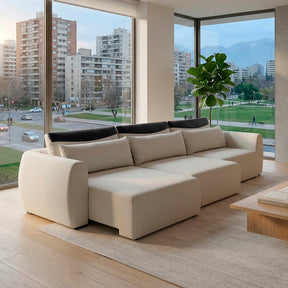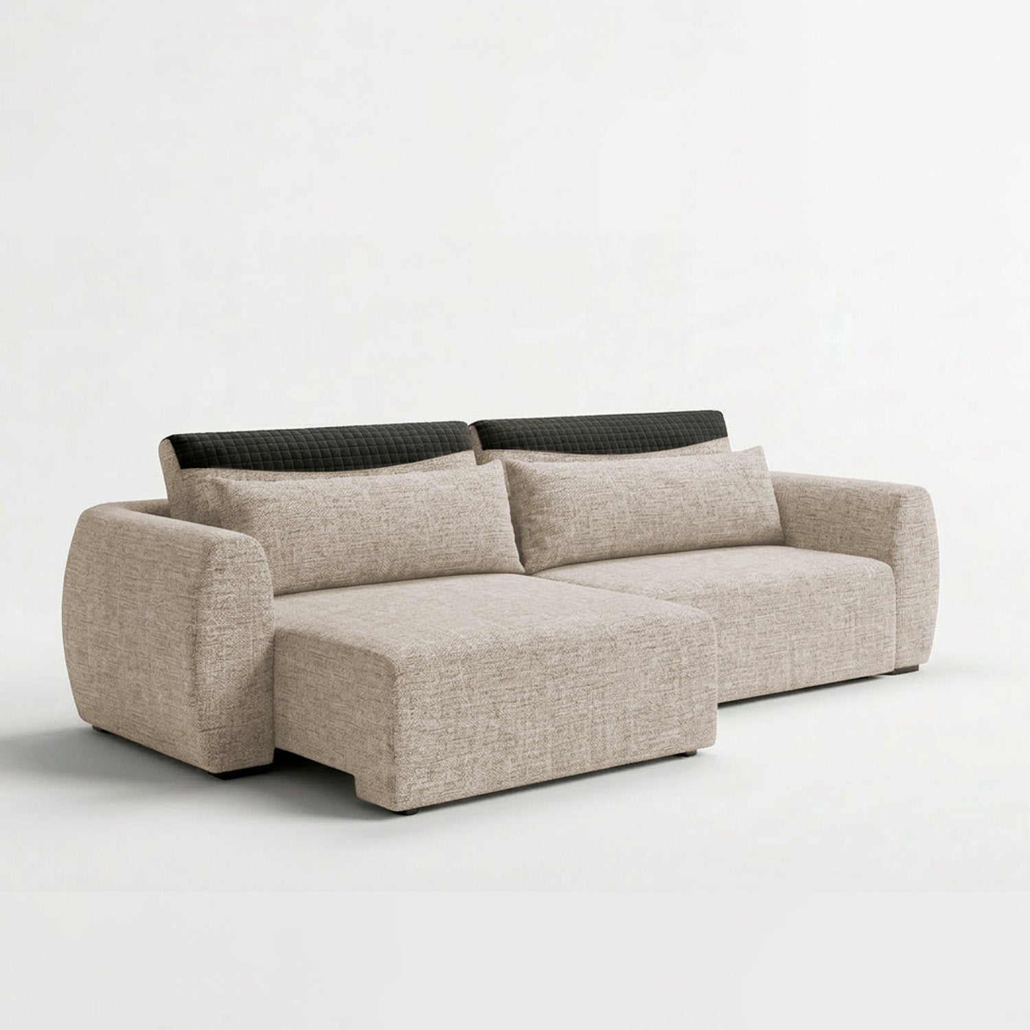 Este es un sofá moderno con un diseño minimalista y líneas limpias. Su tapizado textil y formas redondeadas le dan un aspecto contemporáneo y acogedor, perfecto para espacios actuales que buscan funcionalidad sin sacrificar estilo.