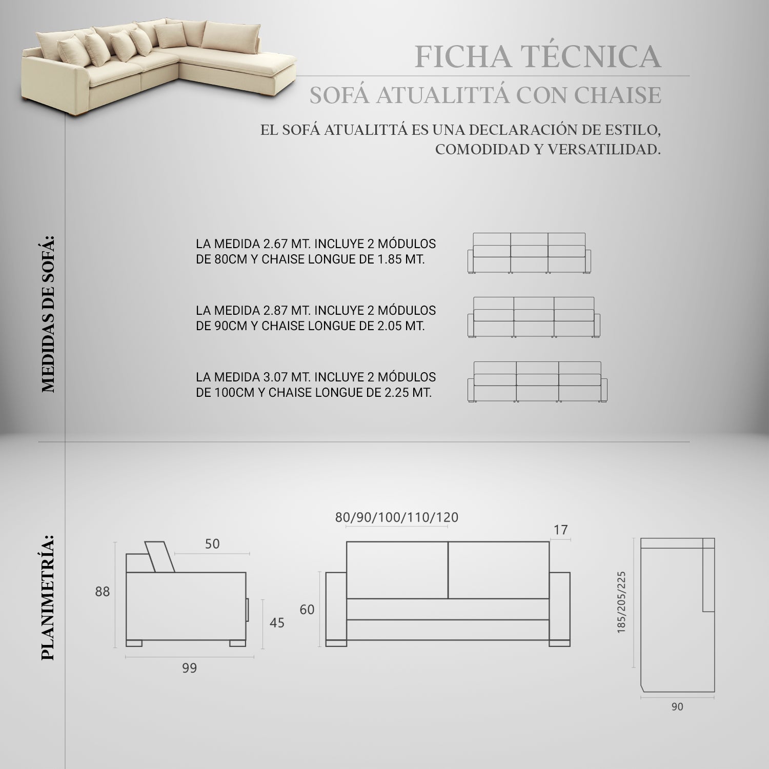 - La medida de 2.67mt contiene 2 módulos de 80cm y chaise longue de 1.85cm.