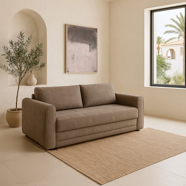 Este sofá cama combina comodidad y funcionalidad con un diseño elegante. Ofrece descanso diario gracias a su espuma D28 e hipersoft, se adapta a distintos estilos decorativos y sus ruedas de silicona facilitan el movimiento sin dañar el piso.