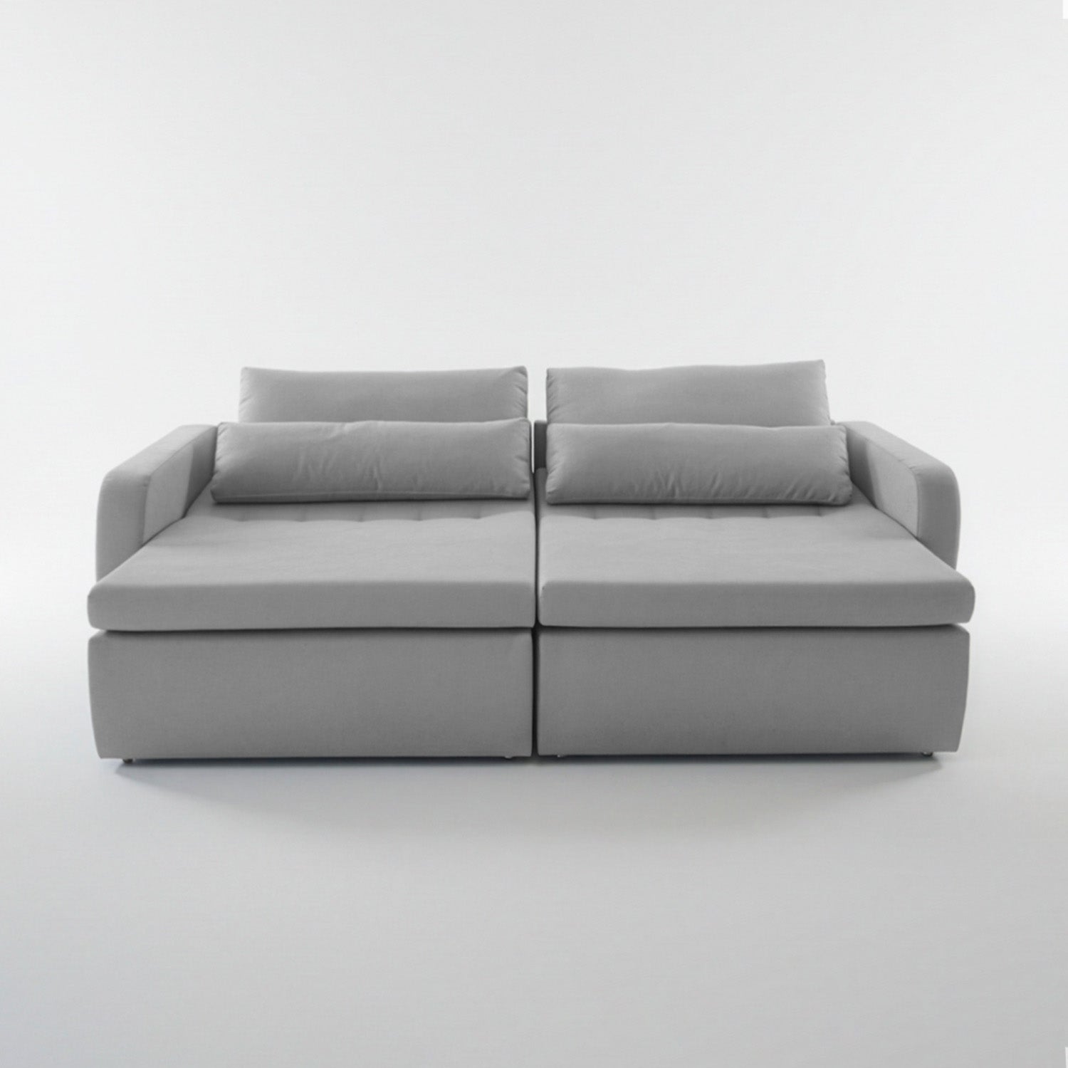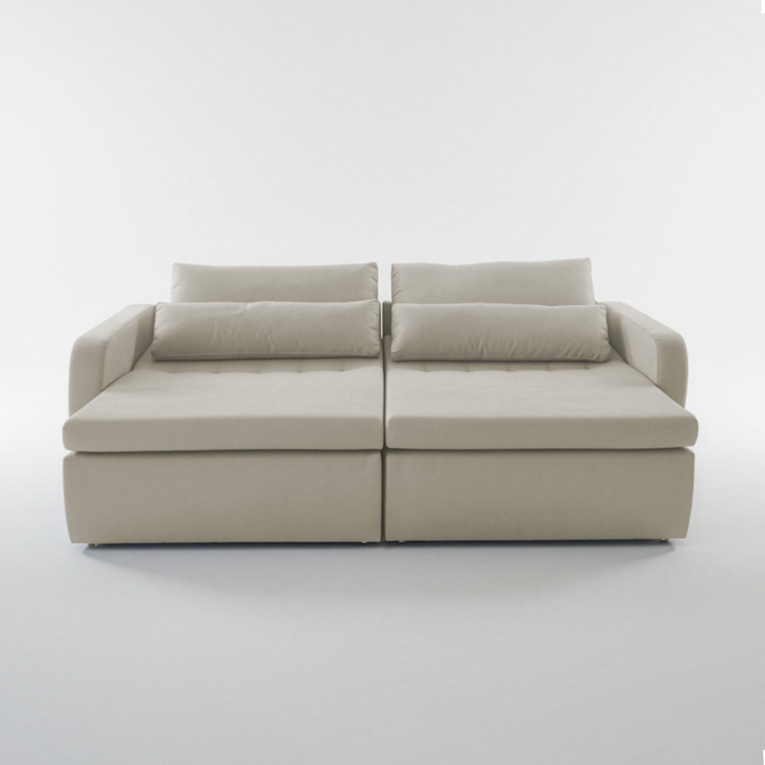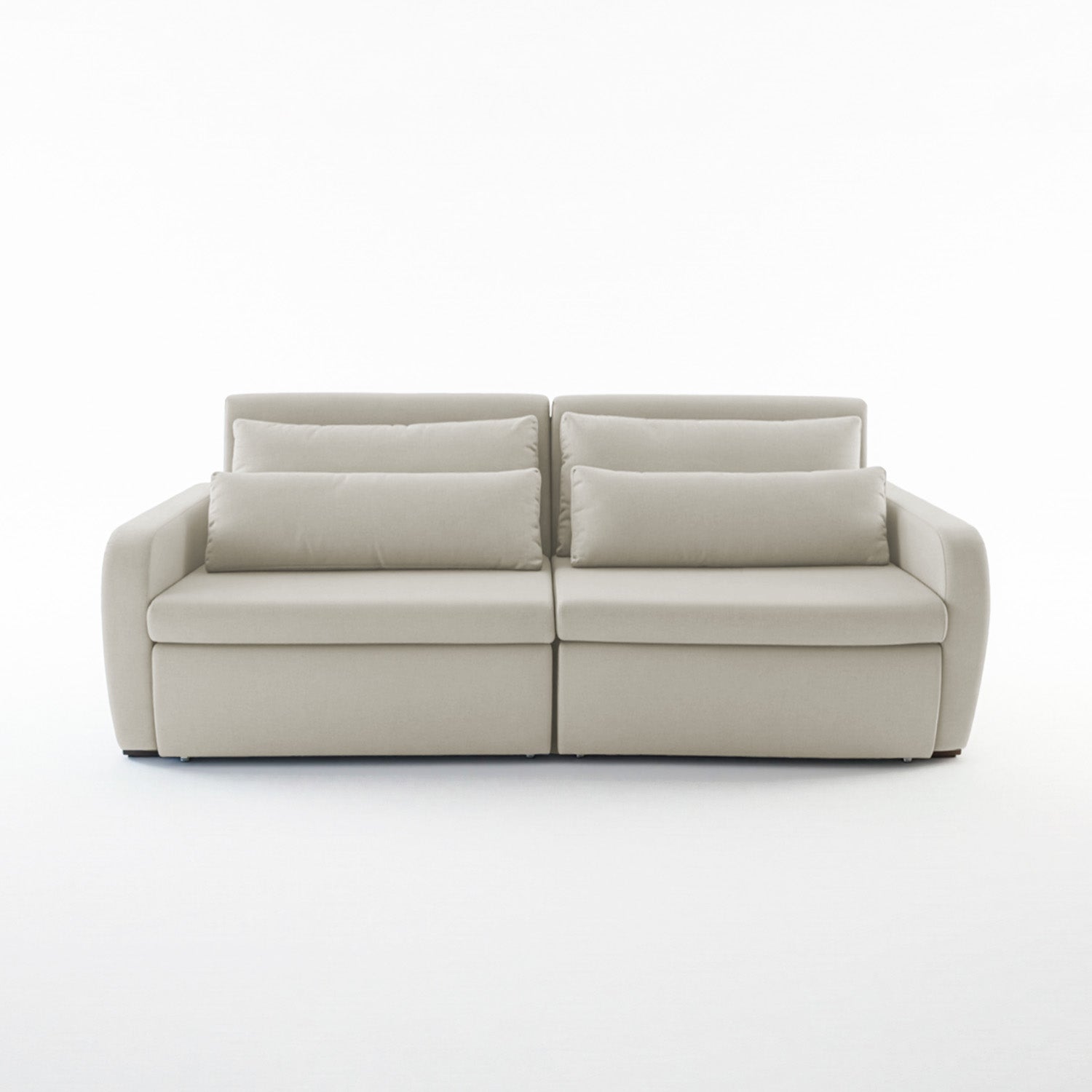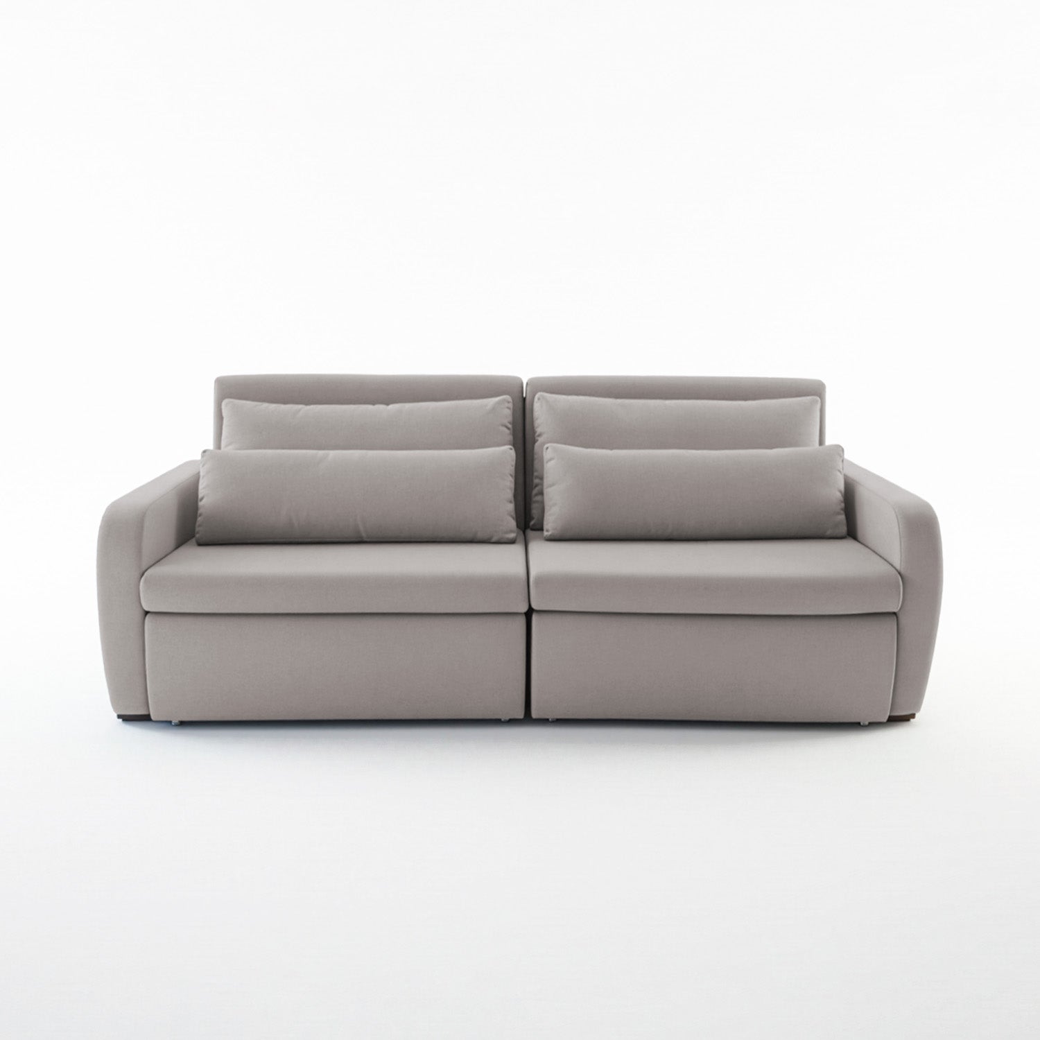 - Respaldo y detalles: Respaldos reclinables con cojines sueltos de fibra siliconada que proporcionan un soporte cómodo y un fácil mantenimiento. Se complementan con cojines decorativos que se pueden personalizar según la tela elegida: lino, ante, polipiel o gamuza.
