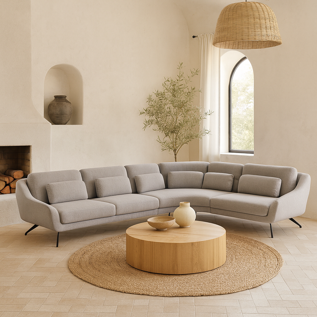 - Respaldo y detalles: Respaldos fijos con cojines sueltos de fibra siliconada que proporcionan un soporte cómodo y un fácil mantenimiento. Se complementan con cojines decorativos que se pueden personalizar según la tela elegida: lino, ante, polipiel o gamuza.
