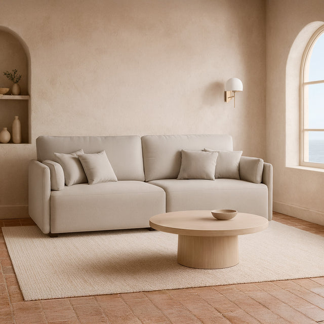 - Alto rendimiento estético: Aspecto sofisticado con tela refinada, cojines sueltos y patas de madera.