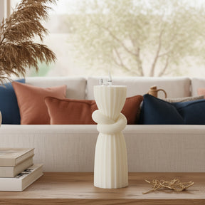 Vela escultórica de 14 cm en tono marfil que combina un pilar acanalado clásico con un nudo central moderno. Su diseño minimalista y líneas arquitectónicas aportan sofisticación y un toque contemporáneo atemporal a cualquier espacio.