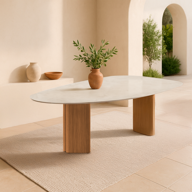 Su diseño escultural y contemporáneo, que fusiona elegancia orgánica con una fuerte presencia arquitectónica. Su cubierta, de forma ovalada con reminiscencias triangulares, rompe con los formatos convencionales y crea un foco visual dinámico en cualquier comedor.