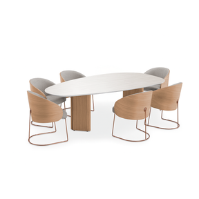 Su diseño escultural y contemporáneo, que fusiona elegancia orgánica con una fuerte presencia arquitectónica. Su cubierta, de forma ovalada con reminiscencias triangulares, rompe con los formatos convencionales y crea un foco visual dinámico en cualquier comedor.