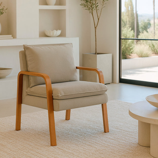 Esta poltrona presenta un diseño elegante y minimalista con una estructura de madera natural que aporta calidez y sofisticación al conjunto. Su tapizado en telas de lino ofrece una apariencia serena y versátil que se adapta fácilmente a diferentes estilos decorativos. Los brazos curvos de madera crean una línea fluida que conecta armoniosamente con las patas, generando una silueta distintiva y atemporal.