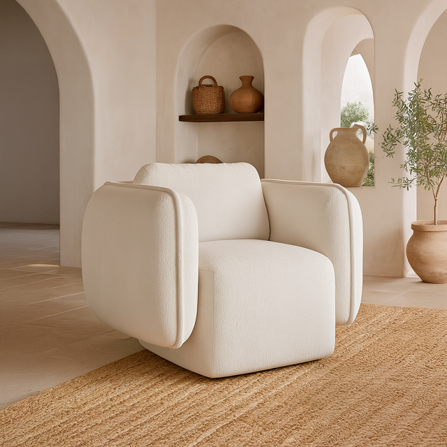 La poltrona tiene un diseño contemporáneo, envolvente y elegante. Destaca por sus formas curvas y voluminosas, con apoyabrazos flotantes, respaldo inclinado y base giratoria oculta. Su tapizado texturizado resalta la suavidad y calidez del diseño, combinando comodidad y estilo moderno en una pieza compacta y sofisticada.