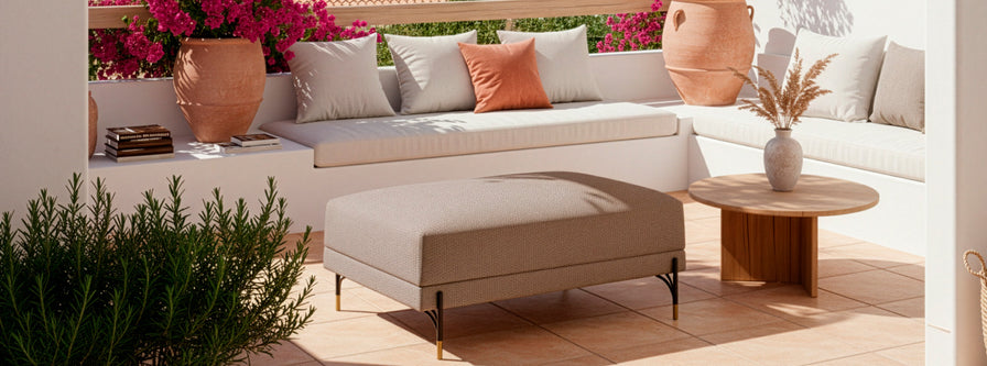 Este pouf es el complemento perfecto para tu espacio exterior. Su tela impermeable, resistente a arañazos y protegida contra rayos UV lo hace ideal para terrazas, soportando sol, lluvia y el uso diario sin perder su encanto.
