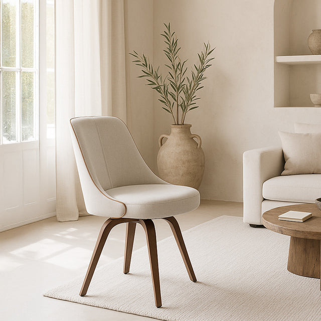 La silla Julieta combina perfectamente diseño contemporáneo y funcionalidad excepcional a través de su respaldo envolvente ergonómico y elegante tapicería neutra que se integra naturalmente en cualquier decoración. La base giratoria y el asiento con espuma D28 proporcionan libertad de movimiento y comodidad duradera, creando la fusión ideal entre estética moderna y practicidad inteligente que transforma cualquier espacio con sofisticación y funcionalidad superior.