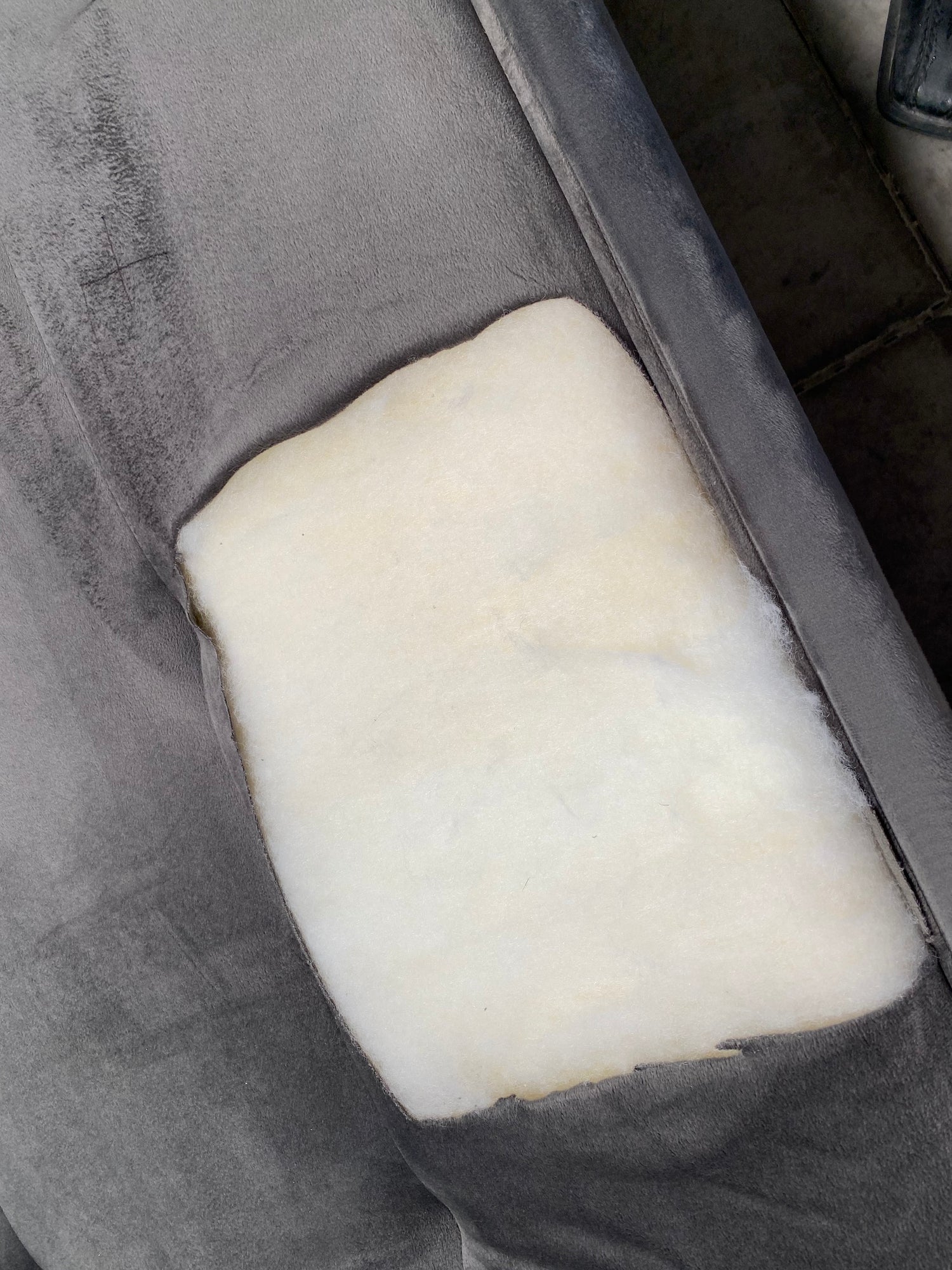 Producto cuenta con recorte de tela en módulo de extensión del sofá.