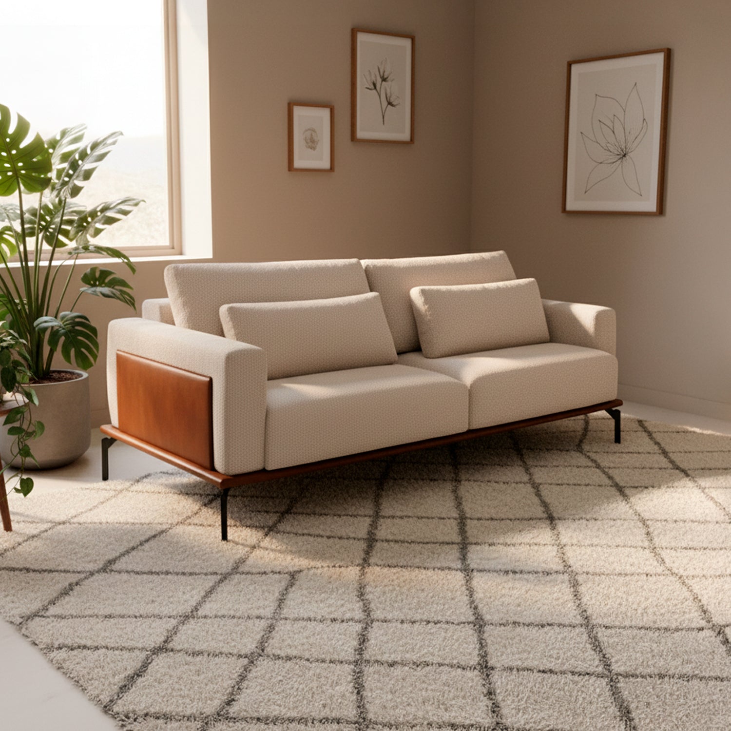 ¡El sofá Desser es una adición perfecta para su hogar! Con su diseño minimalista y detalles en eco cuero color chocolate en los costados, otorga un plus de elegancia y simplicidad a su espacio. ¡Disponible con entrega inmediata!