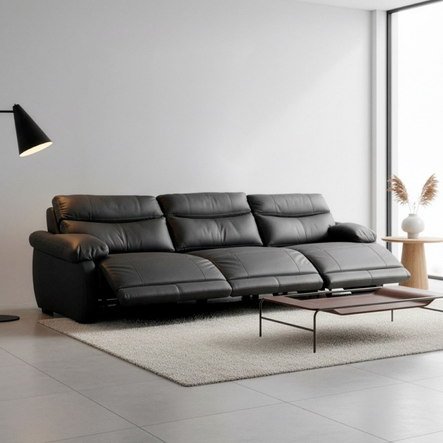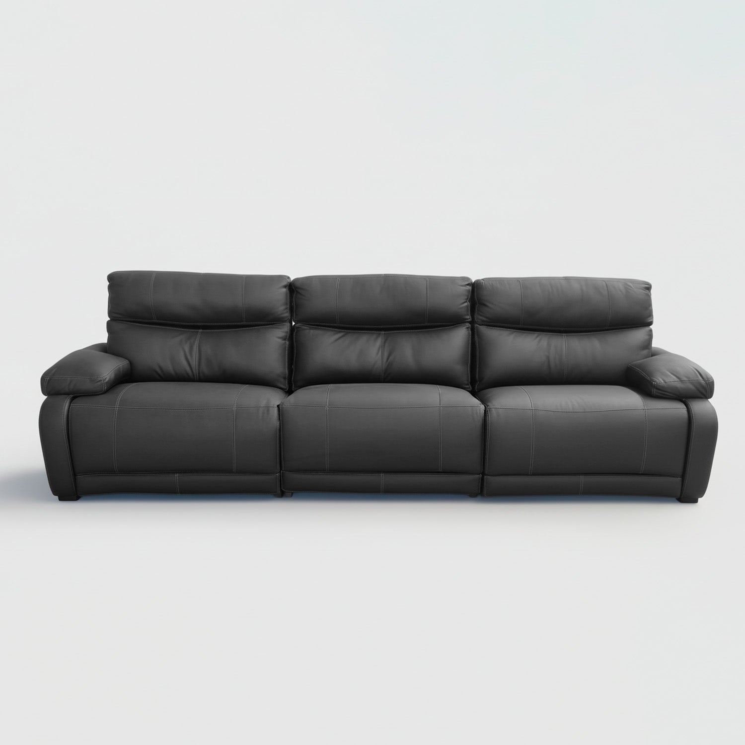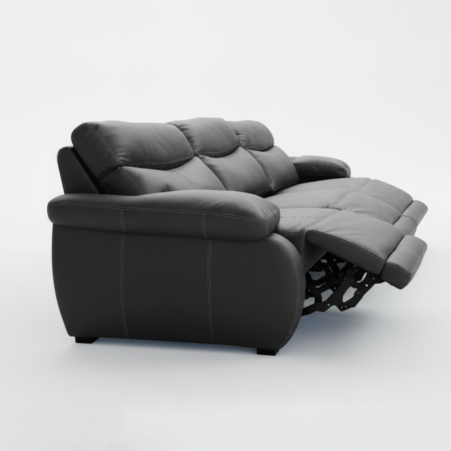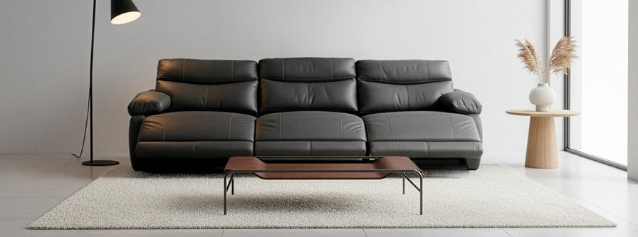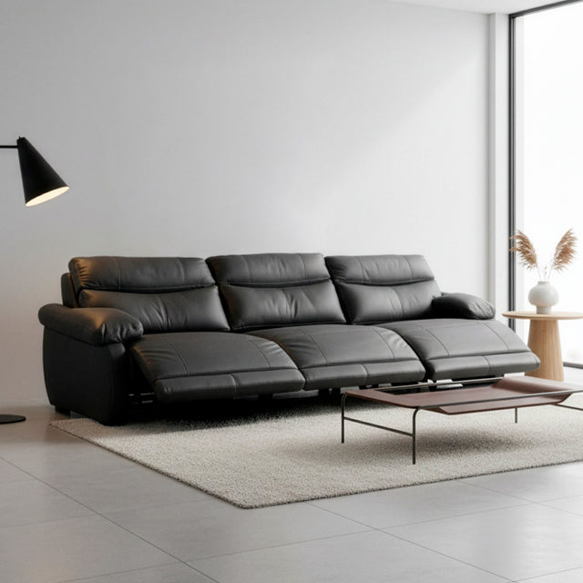 Relájate en el Elbrus sin moverte: su reclinado automático se activa con un botón. Espuma suave envuelta en cuero auténtico negro, con costuras reforzadas que duran años. Elegancia atemporal y confort superior en un solo sofá.