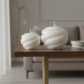 Velas de diseño esférico ondulado que combinan arte y funcionalidad. Su superficie esculpida crea hermosos juegos de luz y sombra, funcionando como piezas decorativas excepcionales. Disponibles en tamaños 7 x 6 cm y 9.5 x 8 cm, su estilo minimalista blanco se adapta a cualquier decoración, transformando tu hogar con elegancia y sofisticación.