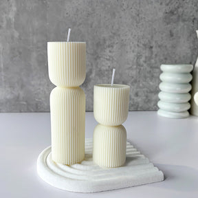 Elegantes velas cilíndricas con textura acanalada en tono crema que transforman tu hogar con estilo contemporáneo. Disponibles en dos tamaños (10cm y 13.3cm), perfectas como acentos decorativos o piezas centrales que aportan calidez y sofisticación a cualquier espacio.